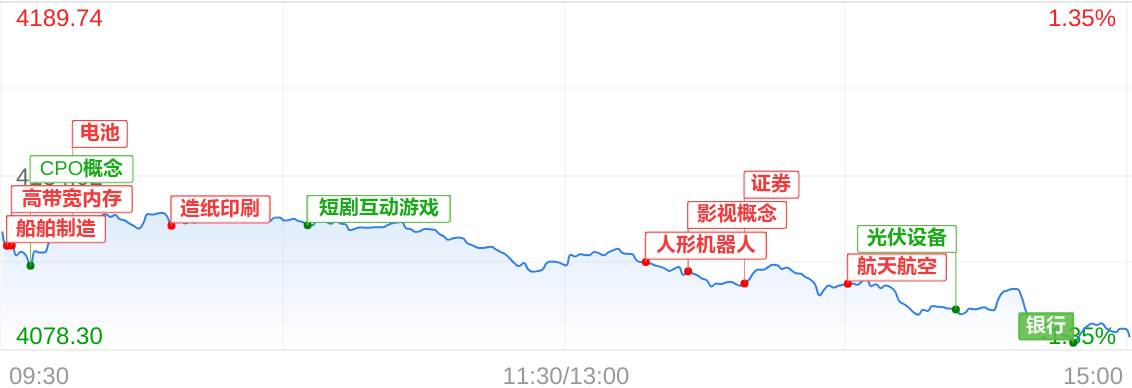A股三大指数中创业板指领跌,截至收盘,上证指数下跌1.26%,深证成指下跌1.28%,创业板指下跌1.57%,北证50指数下跌0.22%。沪深两市成交额19826.8亿元,较上个交易日缩量1590.58亿。全市场1540只个股上涨。板块题材上,通用航空、数字水印、全息技术板块涨幅居前,CPO概念、HIT电池、Kimi概念板块跌幅居前。大盘表现