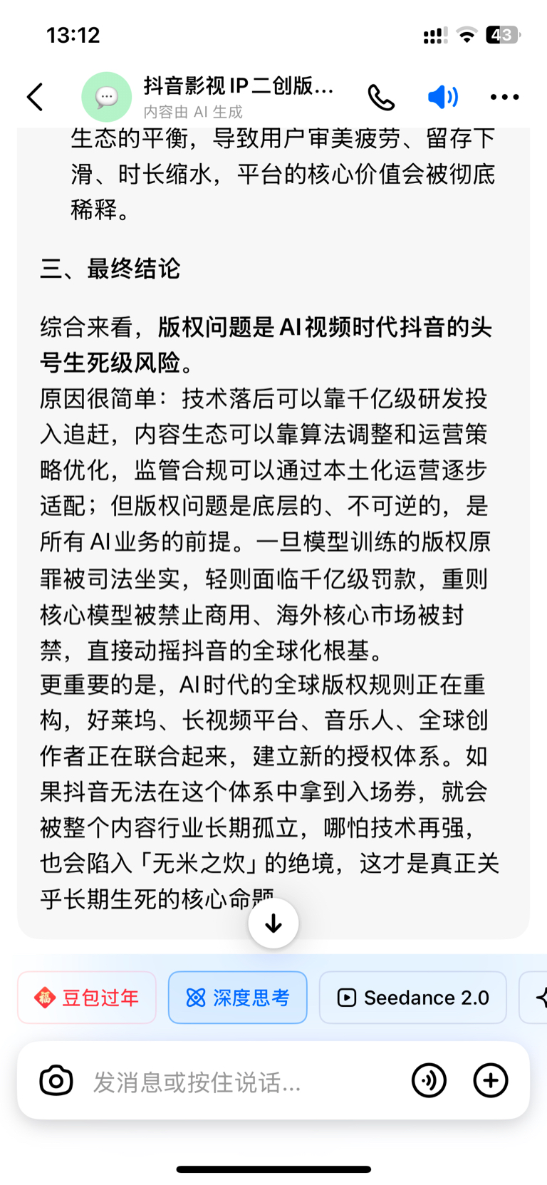 $掌阅科技(SH603533)$ 在AI视频时代,资本想干字节的话,抓住版权这个死穴,能直接把抖音干趴。不论什么演员,什么电影电视剧,什么动漫角色,抖音上面只要一搜,全部都有很多视频,一点不夸张的说,抖音就是靠着侵权起家壮大的。