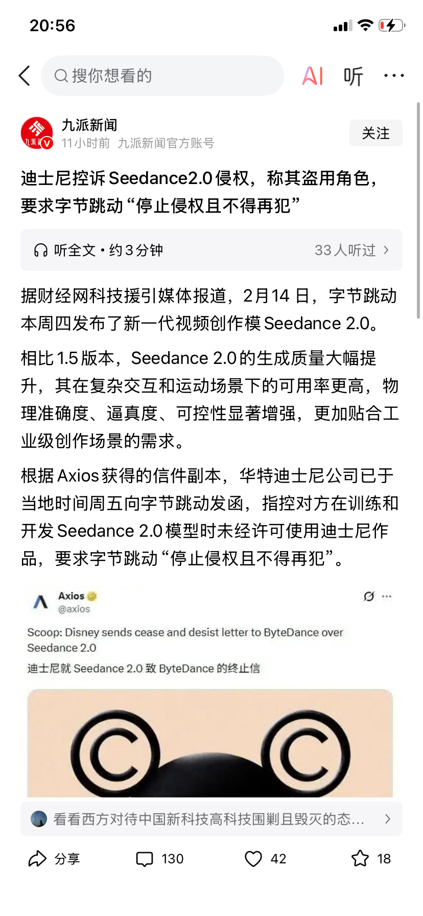 迪士尼控诉Seedance2.0侵权,称其盗用角色,要求字节跳动“停止侵权且不得