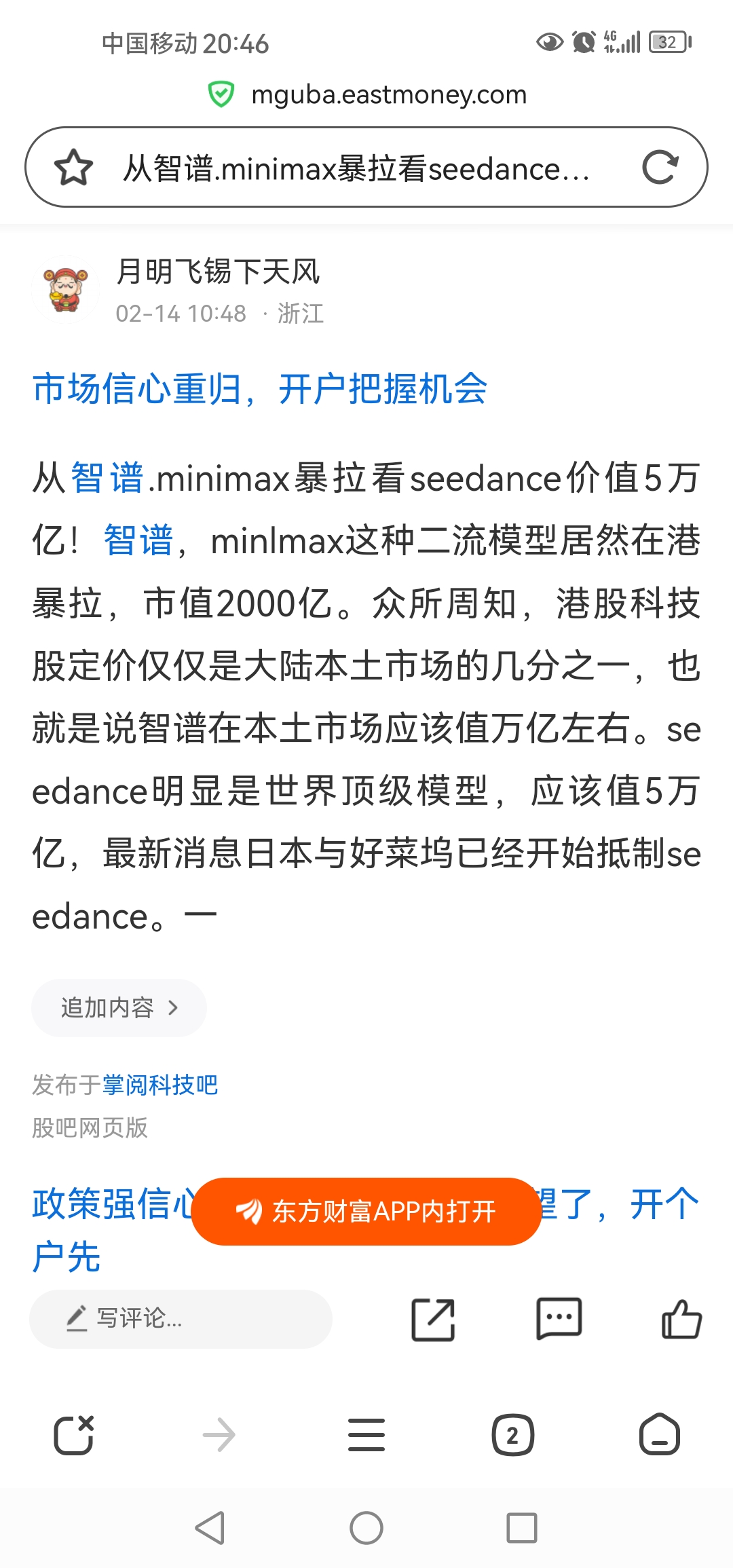 多头胆小太小!看多头的发言仅仅满足于7个板,大多数三四个板。我不得不说,太谨慎了,当然有时谨慎是优点。依据近期在港暴拉的智谱与minimax作基准,seedance值5万亿。作为seedance的影子股,你说掌阅值多少?别的不说,单说9日至12日连续四天开盘挂单百亿以上,你从前见过吗?
