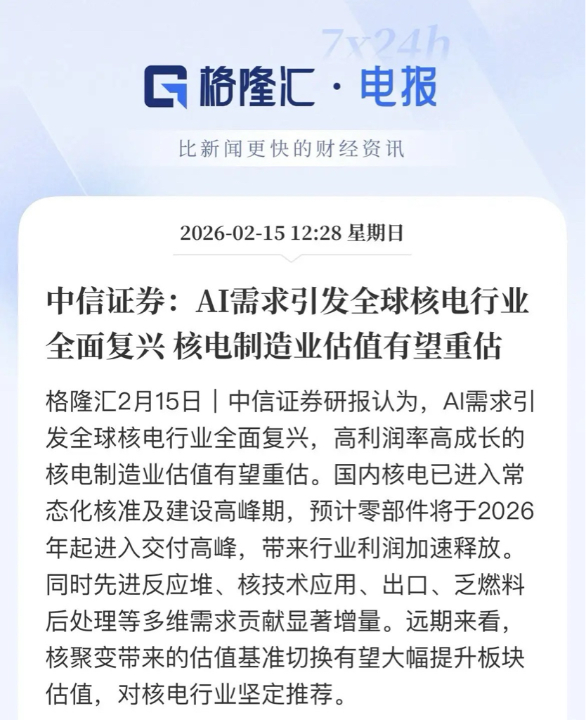 今日,中信证券最新研报指出:AI需求正引发全球核电行业全面复兴,国内核电进入常态化核准及建设高峰期,零部件从今年起将进入交付高峰。凭借高利润率,核电制造业的估值有望迎来系统性重估。