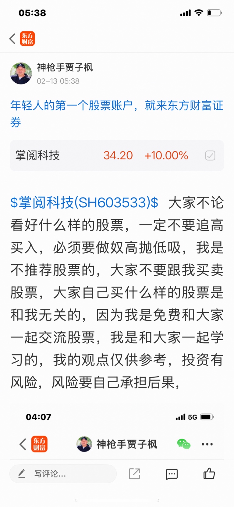 $掌阅科技(SH603533)$ 大家不论看好什么样的股票,一定不要追高买入,必须要做好高抛低吸,我是不推荐股票的,大家不要跟我买卖股票,大家自己买什么样的股票是和我无关的,因为我是免费和大家一起交流股票,我是和大家一起学习的,我的观点仅供参考,投资有风险,风险要自己承担后果,