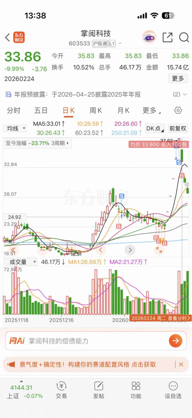 $掌阅科技(SH603533)$ 随便跌,大部分在五连板前就撤了,就留了100股你随便吧