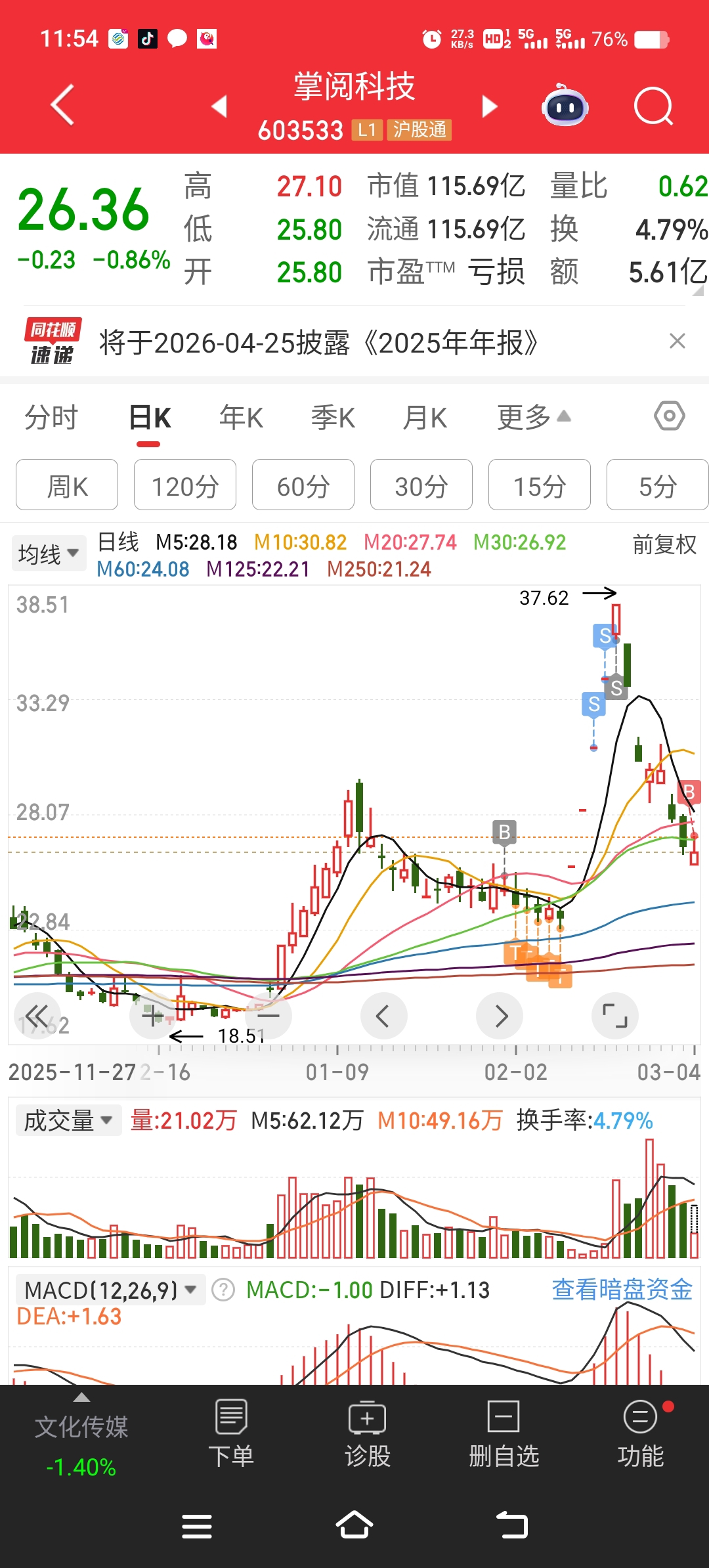 $掌阅科技(SH603533)$ 空仓也无聊,看你让我赚五个板的情份上,我帮忙买几手接盘