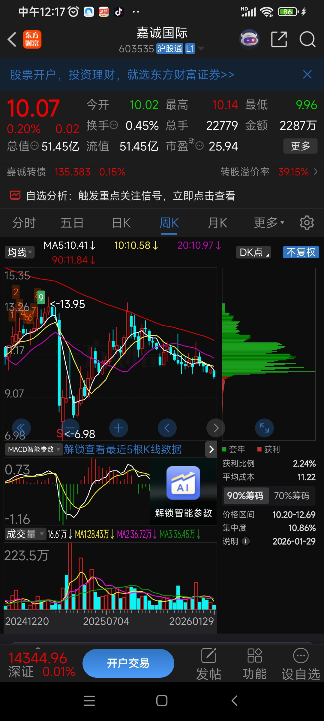 $嘉诚国际(SH603535)$ 看周线连跌29周,看日线连跌一个月。两市5000多只票有哪只有它强,谁干的?庄?有庄吗?哪个是庄。看下筹码分布全员被套,有庄吗?持仓多少。庄的成本?吹的人不少。现在是底加仓猛干买它一佰万股。有买一佰万股的股民的钱的人会这么漂吗?还是看看月线,日线,你的持仓成本。问一下持有能解套吗?能持有。解不了套果断止换赛道。股吧比妙股热闹。此股特有!