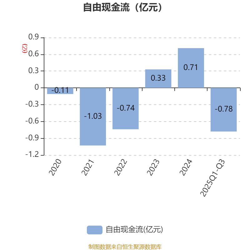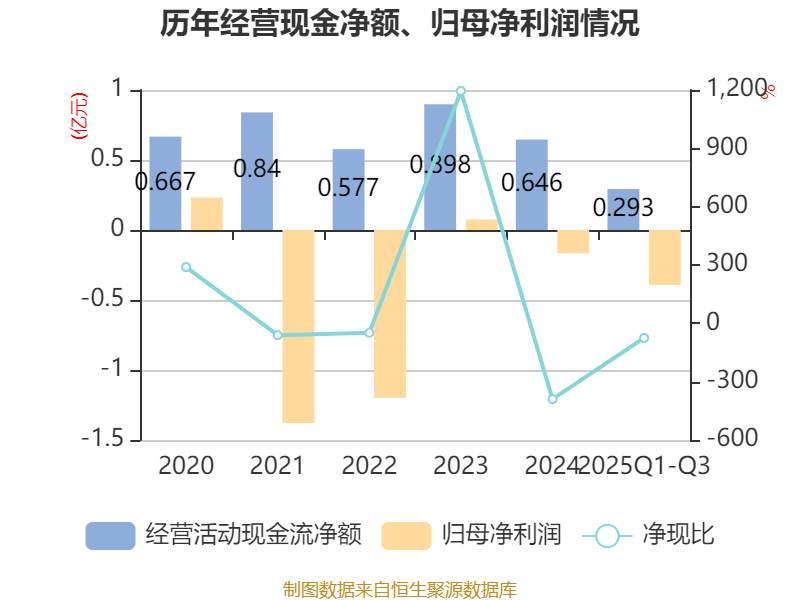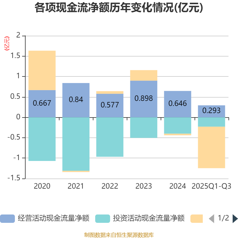 2025年前三季度,公司经营活动现金流净额为2934.31万元,同比下降44.3%;筹资活动现金流净额-1.02亿元,同比减少6513.28万元;投资活动现金流净额-2296.31万元,上年同期为-4400.5万元。