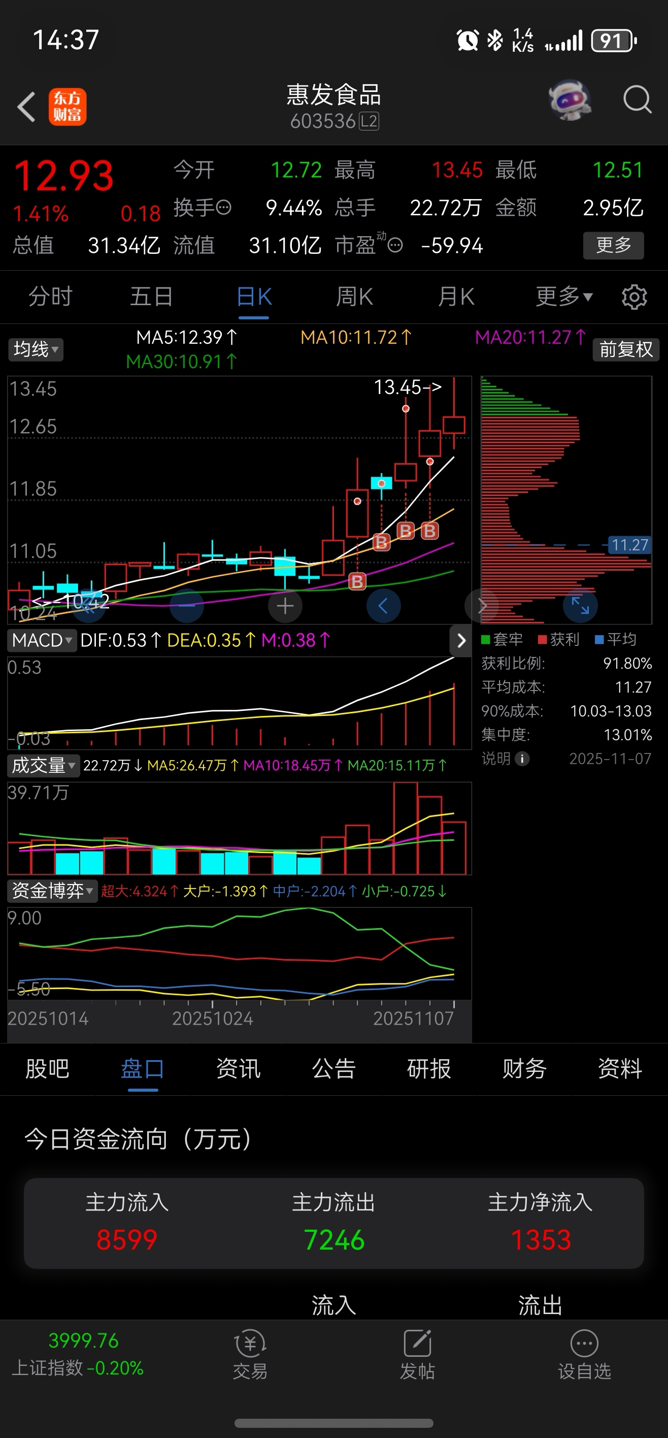 $惠发食品(SH603536)$ 最终就等了个13以下主动走弱
