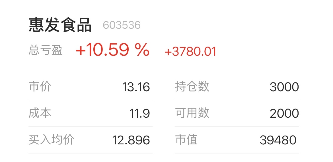 $惠发食品(SH603536)$ 一次不慎的追高,两天时间,三万多的利润变三千多