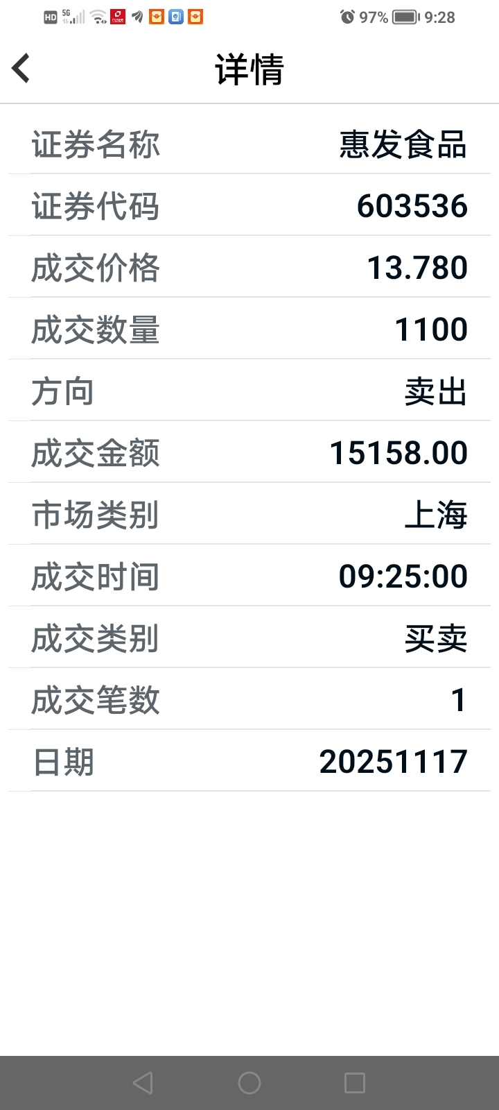 $惠发食品(SH603536)$ 趁庄家诱多,早盘开盘竞价就出了,换了海欣食品。天天赚盒饭钱
