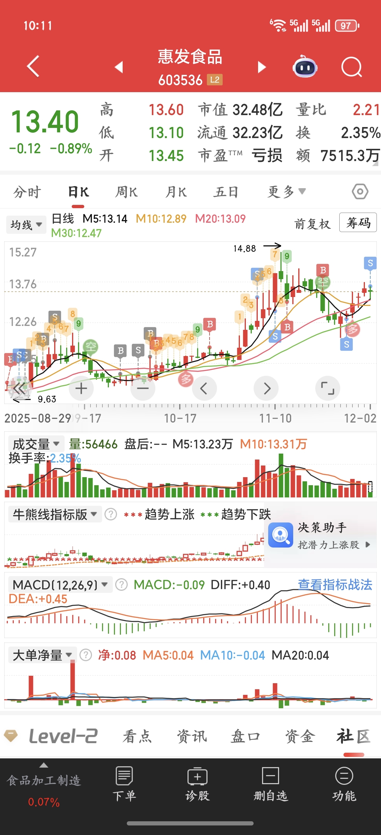 $惠发食品(SH603536)$ 我出了,祝在里面的兄弟姐妹发财