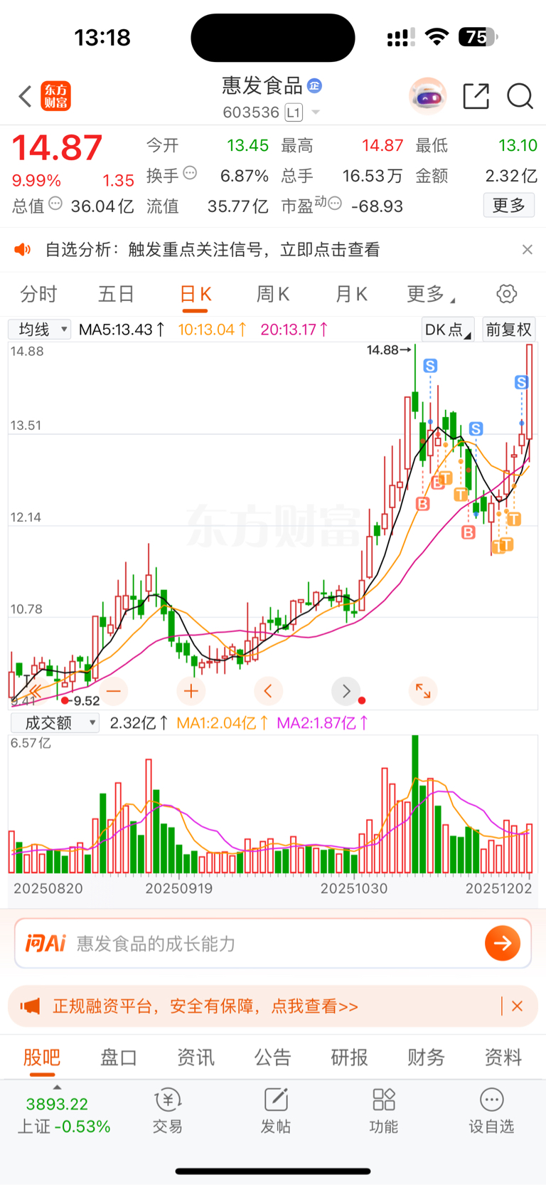 $惠发食品(SH603536)$ 拿了快一个月也没吃上肉