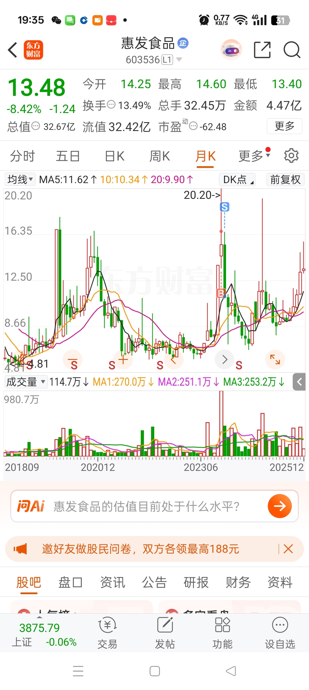 $惠发食品(SH603536)$ 你们再慌什么?多大点波动就慌成这网,哥们当初直接腰斩,嘿嘿