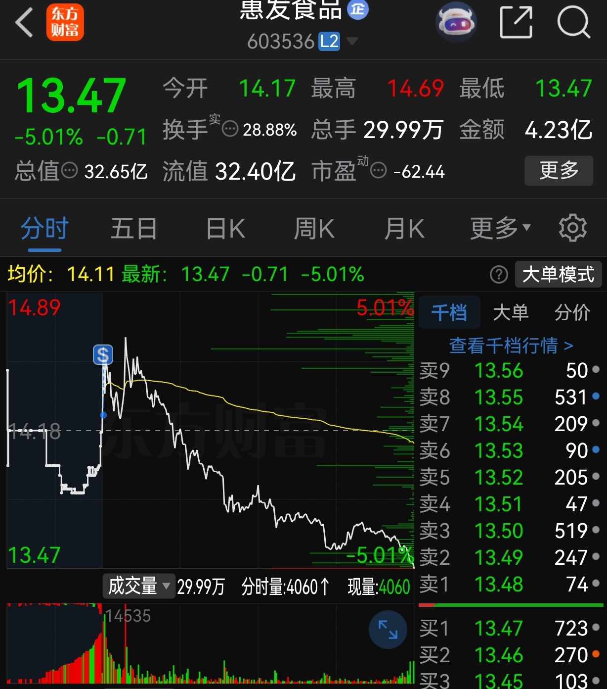 $惠发食品(SH603536)$ 今天走势完全符合预期,竞价就跑了,尾盘刚好打到20日线,有想接回来的冲动,搏明天安记反包冲高的预期,想想还是算了,还是自律一点#炒股日记#