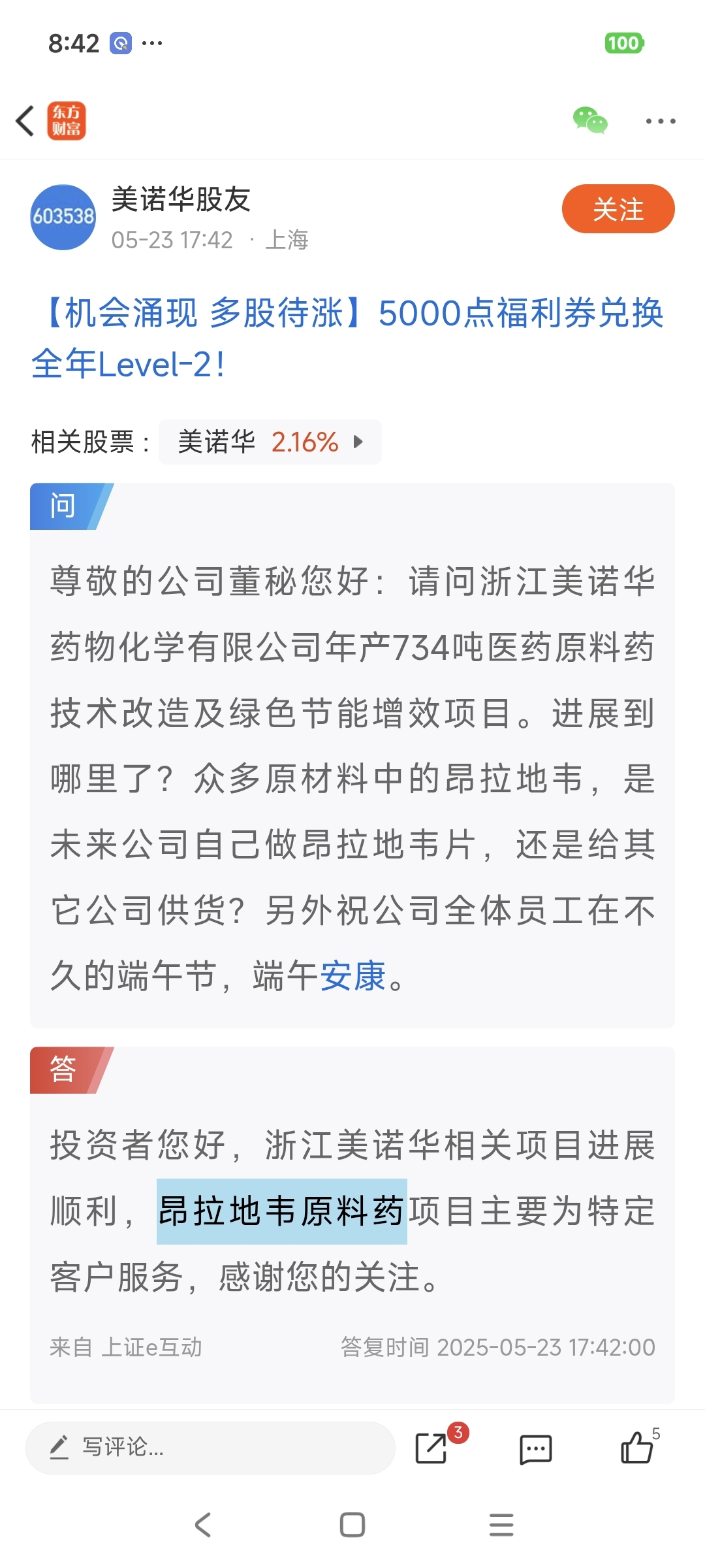 $美诺华(SH603538)$ 10吨昂拉地韦原料药的生产能力,明年预计可以扩产到30吨每年,下游公司是$众生药业(SZ002317)$
