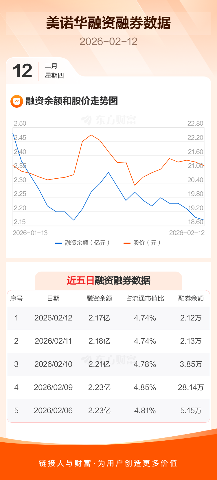 交易所最新数据显示,美诺华于2026年2月12日获融资买入587.11万元,融资偿还755.10万元,当日融资净偿还167.99万元。目前,该股融资余额2.17亿,占流通市值比例为4.74%。