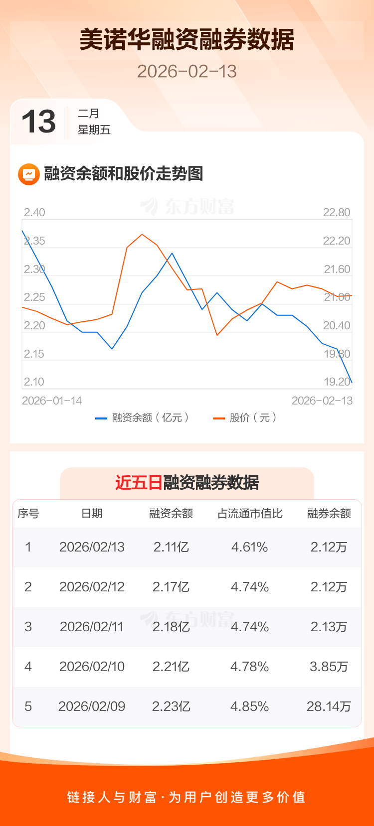 交易所最新数据显示,美诺华于2026年2月13日获融资买入612.77万元,融资偿还1173.13万元,当日融资净偿还560.36万元。目前,该股融资余额2.11亿,占流通市值比例为4.61%。