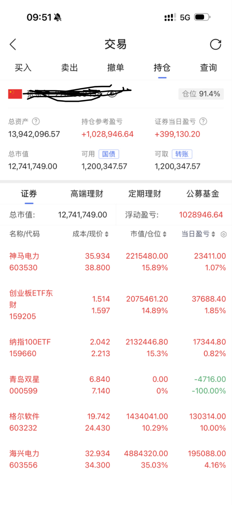 $海兴电力(SH603556)$ 早盘开盘,已经第一时间重仓买入海兴电力603556,另外已经出货高开低走的青岛双星000599。反复推荐格尔软件603232 继续涨停板,实力有目共睹!!!
