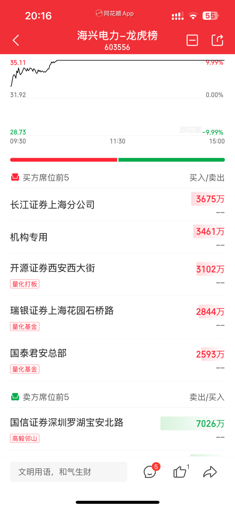 $海兴电力(SH603556)$ 全是讲话打板,明天放量见顶了