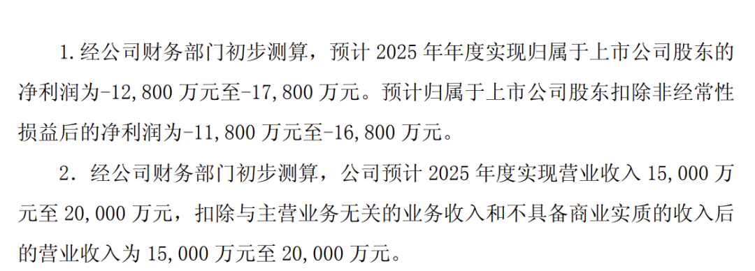 曹晔上任ST起步董秘几天后,公司就发布了一份并不理想的业绩预告。ST起步预计2025年实现归母净利润-1.28亿元至-1.78亿元,扣非净利润-1.18亿元至-1.68亿元,均为亏损。此外,公司预计2025年营收、扣除与主营业务无关的业务收入和不具备商业实质的收入后营收均为1.5亿元至2亿元,低于3亿元。