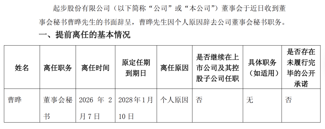 ST起步2月9日晚间披露,公司董事会于近日收到董事会秘书曹晔的书面辞呈,曹晔因个人原因辞去公司董事会秘书职务。曹晔离任日期为2月7日,距离董事会1月19日审议通过聘任议案仅过去20日。