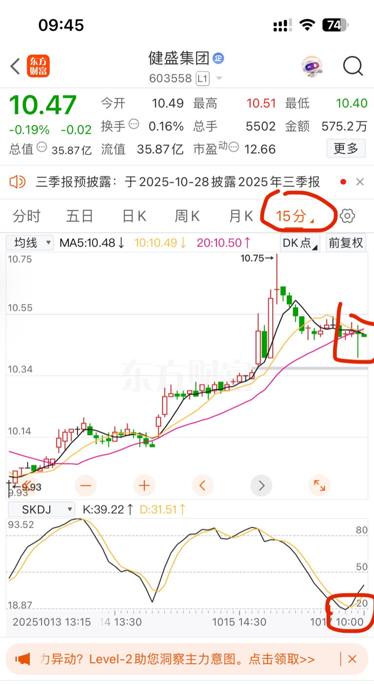 $健盛集团(SH603558)$ 15分时均线粘合。上不去就下补缺了。加油哦。我昨天10.47才T回去你。别洗啦