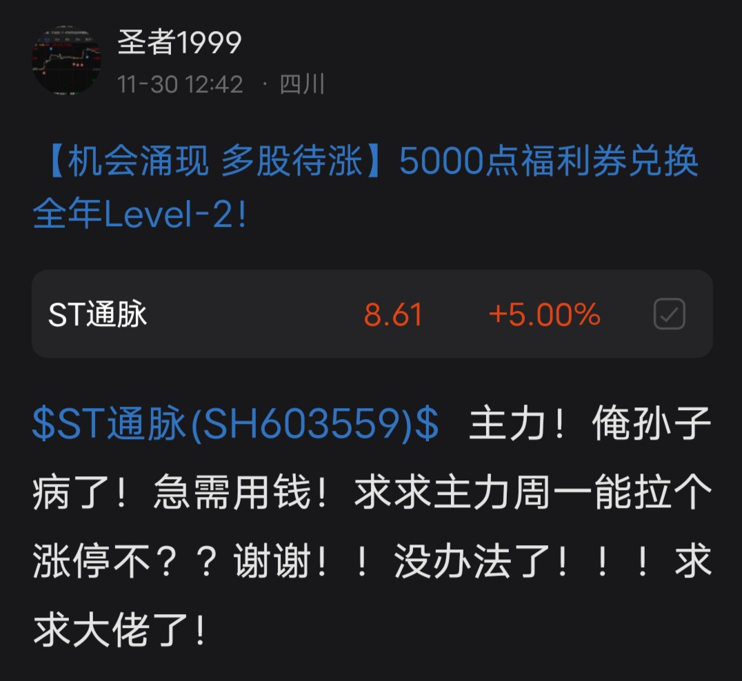 $ST通脉(SH603559)$ 再发一次:谢谢庄家大佬!谢谢!感感谢………隔夜板单我卖了!!本来这货可以好几个板的!拿了5个多月了!时也命也!…总算有钱救孙子了!!!感谢……!!
