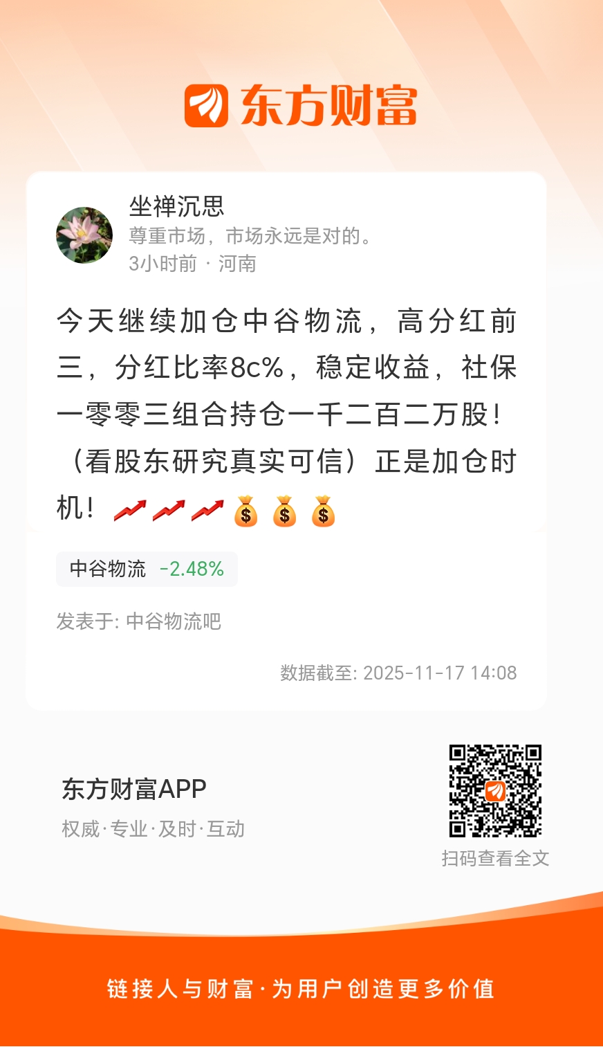 今天继续加仓中谷物流,高分红前三,分红比率8c%,稳定收益,社保一零零三组合持仓一千二百二万股!(看股东研究真实可信)正是加仓时机!
