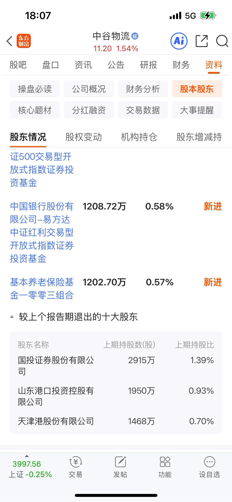 中谷物流公司A股市场分红前三甲…近期中国社保养老基金买入1202万股…长期持有可