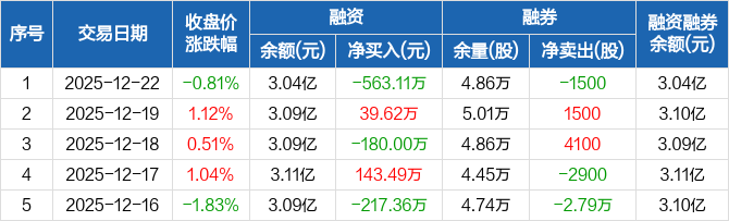 珍宝岛:融资净偿还563.11万元,融资余额3.04亿元(12-22)
