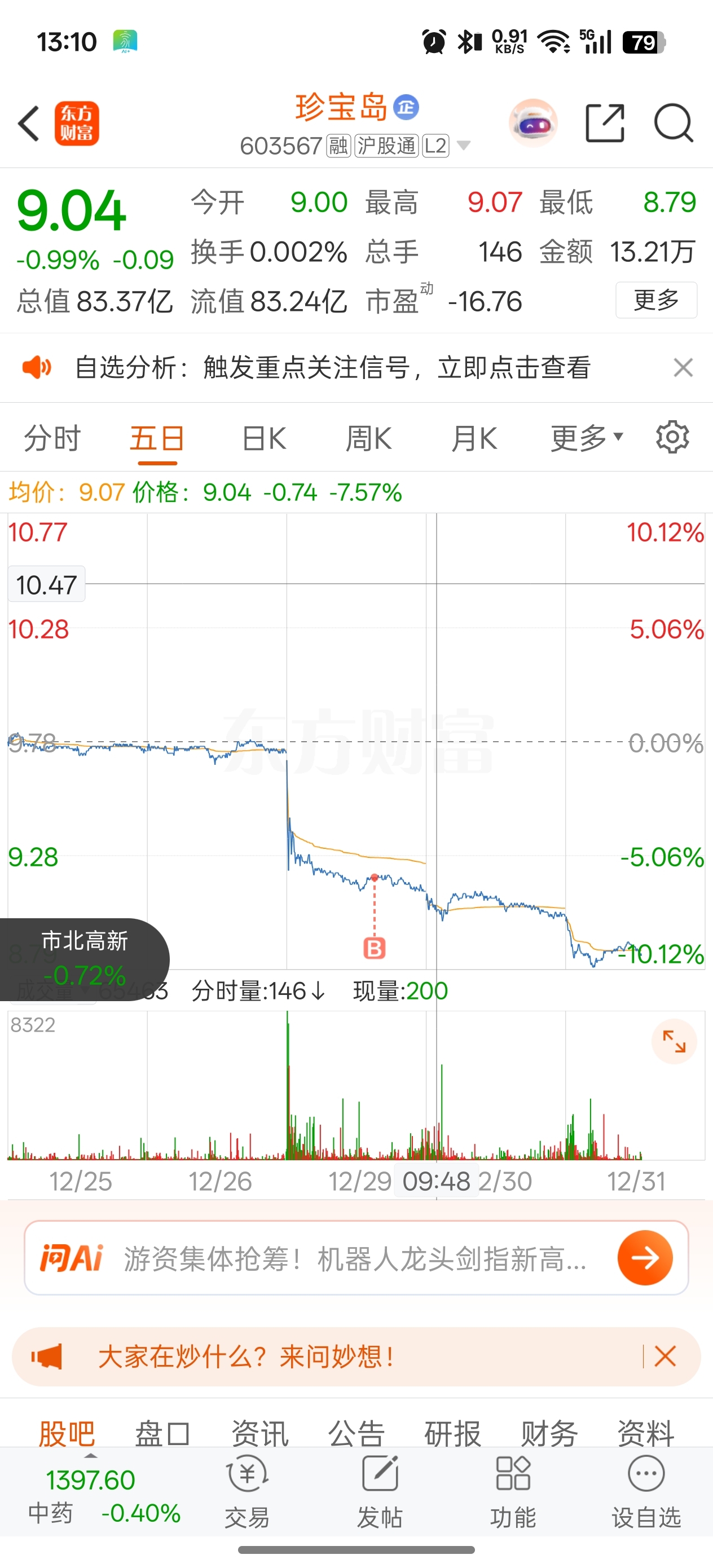 $珍宝岛(SH603567)$ 当时想抄底,被套了活该吧