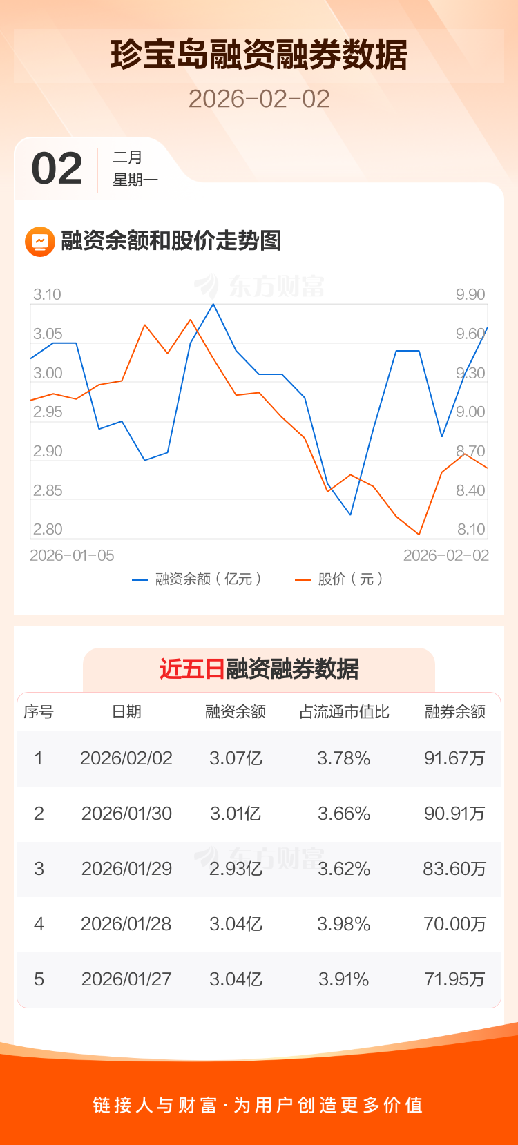 交易所最新数据显示,珍宝岛于2026年2月2日获融资买入2824.33万元,融资偿还2285.53万元,当日融资净买入538.8万元。目前,该股融资余额3.07亿,占流通市值比例为3.78%。