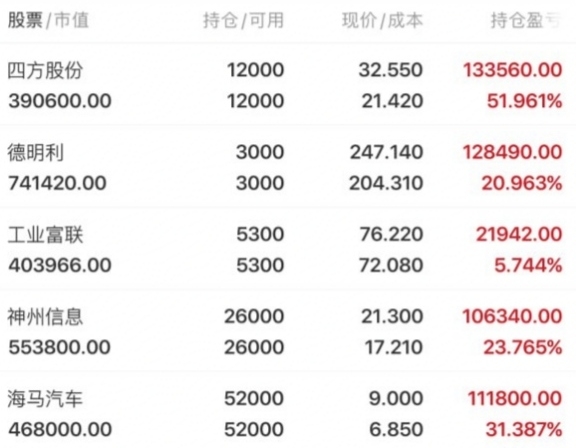 目前个人持有、四方股份、德明利、工业富联、神州信息、海马汽车,胜不骄败不馁,祝所有老铁收获满满。选择好的赛道才能在市场游刃有余;市场需要调整,板块轮动过快,个股也不例外,需要更敏锐的洞察力,所提标的每天都在实时观察,最近的操作相信很多一路支持的老铁有目共睹;如有质疑可持续验证也可爬楼观看,在此祝所有老铁投资顺利!股市长虹!!!#社区牛人计划#