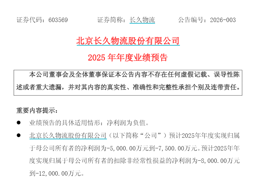 长久物流在公告中强调,业绩预告数据仅为初步核算数据,具体准确的财务数据以公司正式披露的经审计后的2025年年度报告为准。