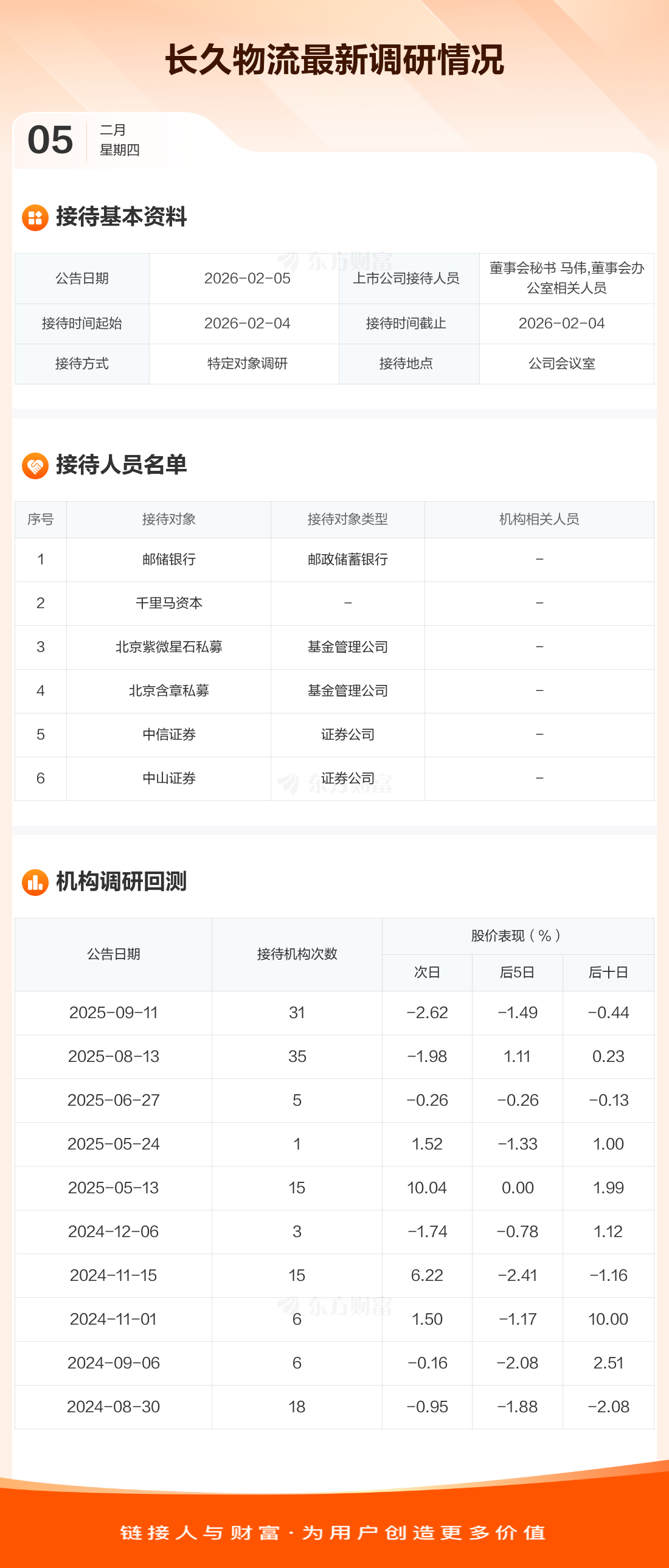 长久物流2月5日公告称,2月4日接待邮储银行等6家机构调研。接待人员包括董事会秘书 马伟,董事会办公室相关人员。