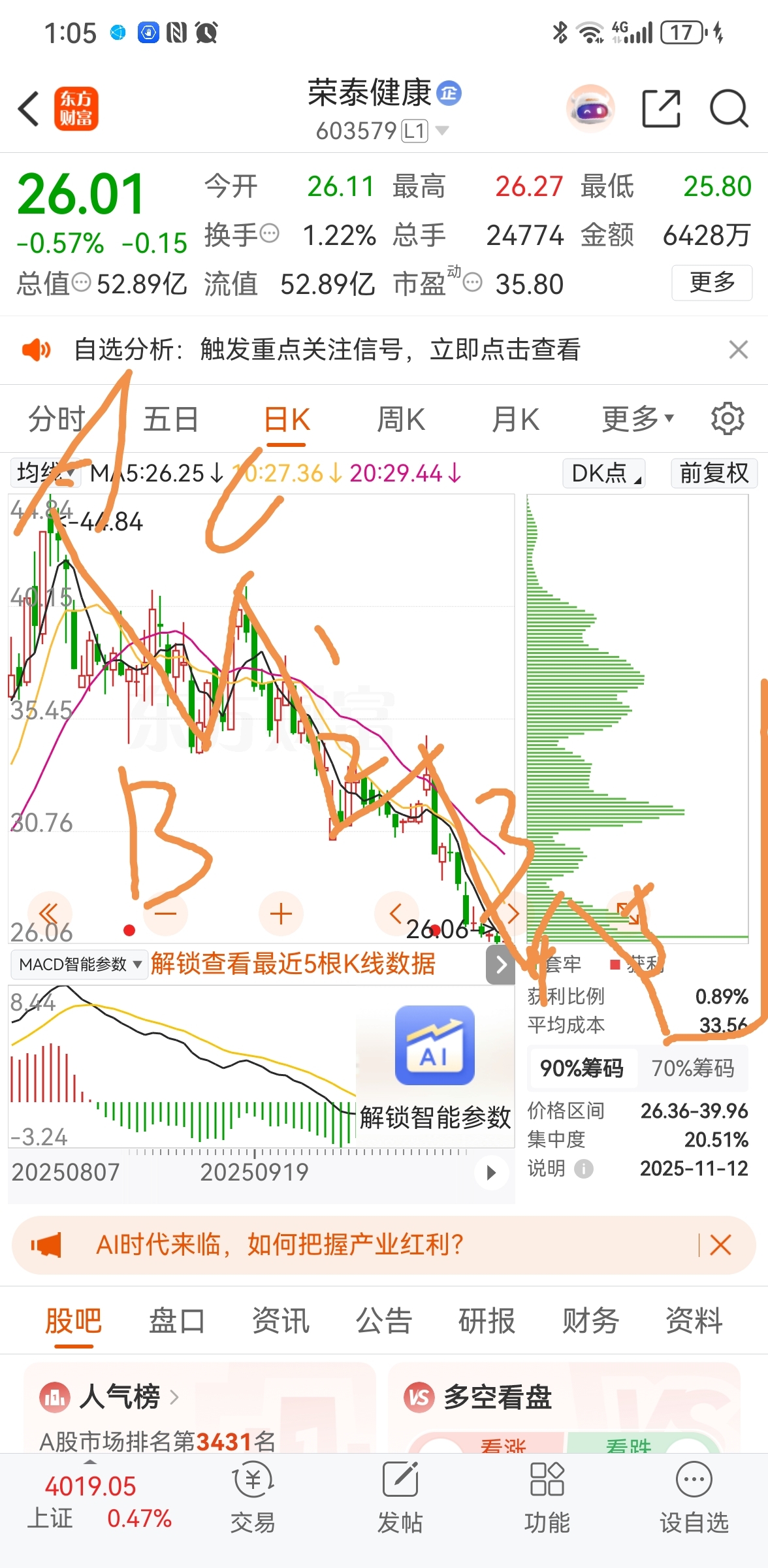$荣泰健康(SH603579)$ 目前处于下跌C浪中的三浪三,再跌几天后就是三浪四反弹,然后再下跌三浪五。这个走势要破前低21元,会不会破16.89元不知道 ,但极限情况是在这附近。