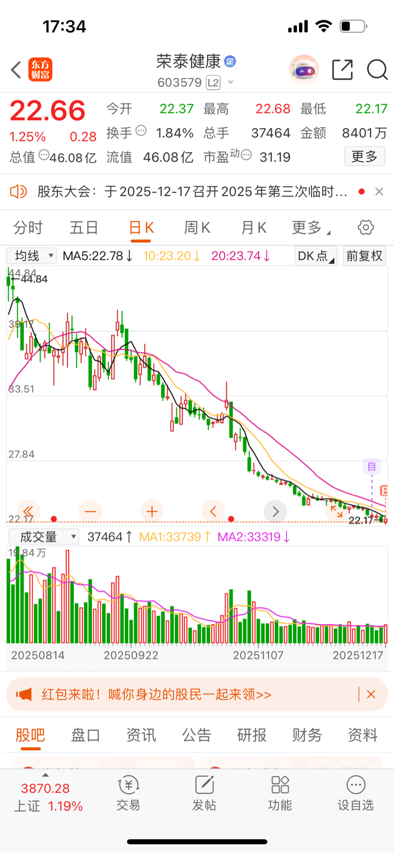 $荣泰健康(SH603579)$ 今天来试试底,搞20个点就撤