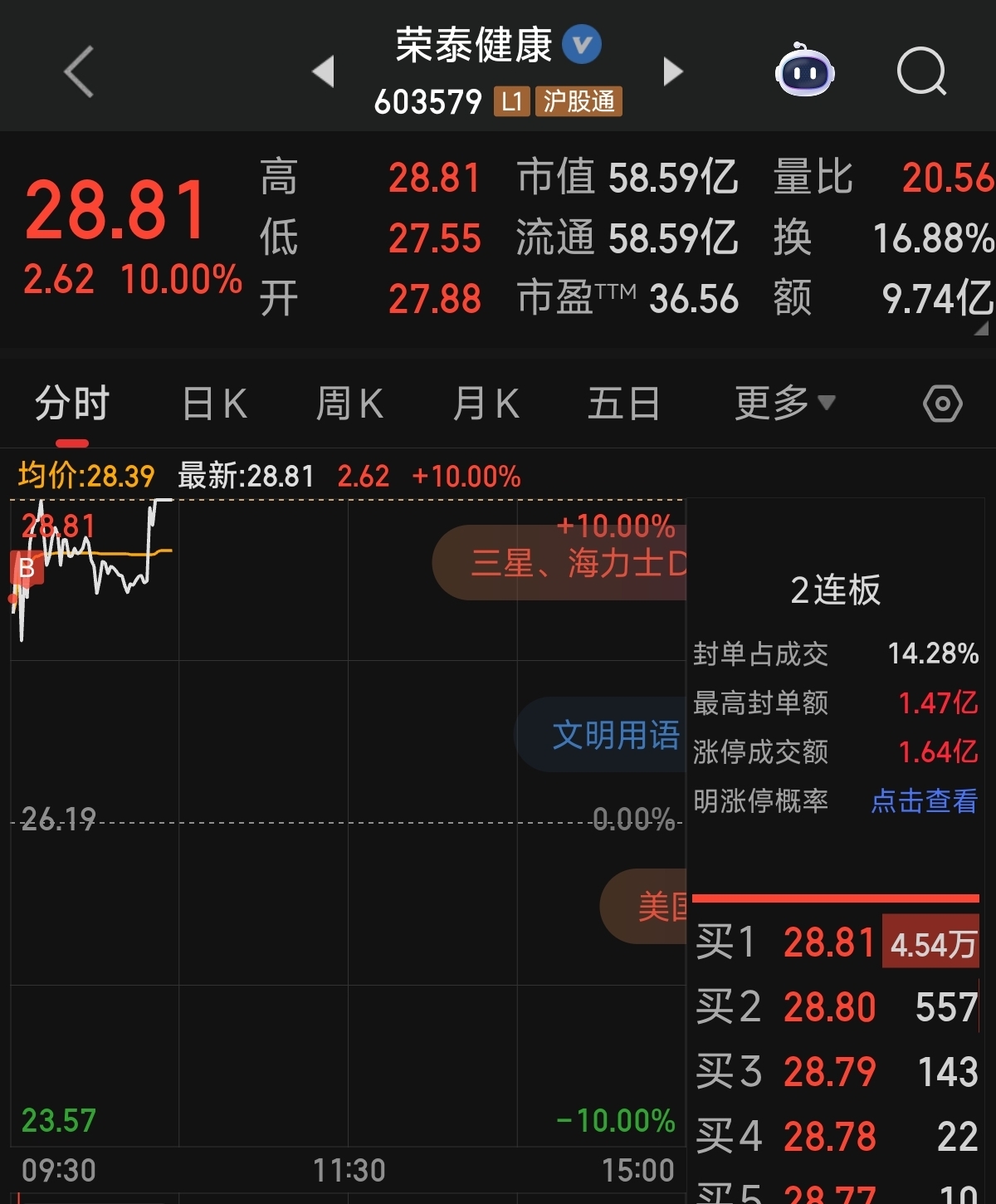$荣泰健康(SH603579)$ 希望不要开板,明天来个连板!冲!