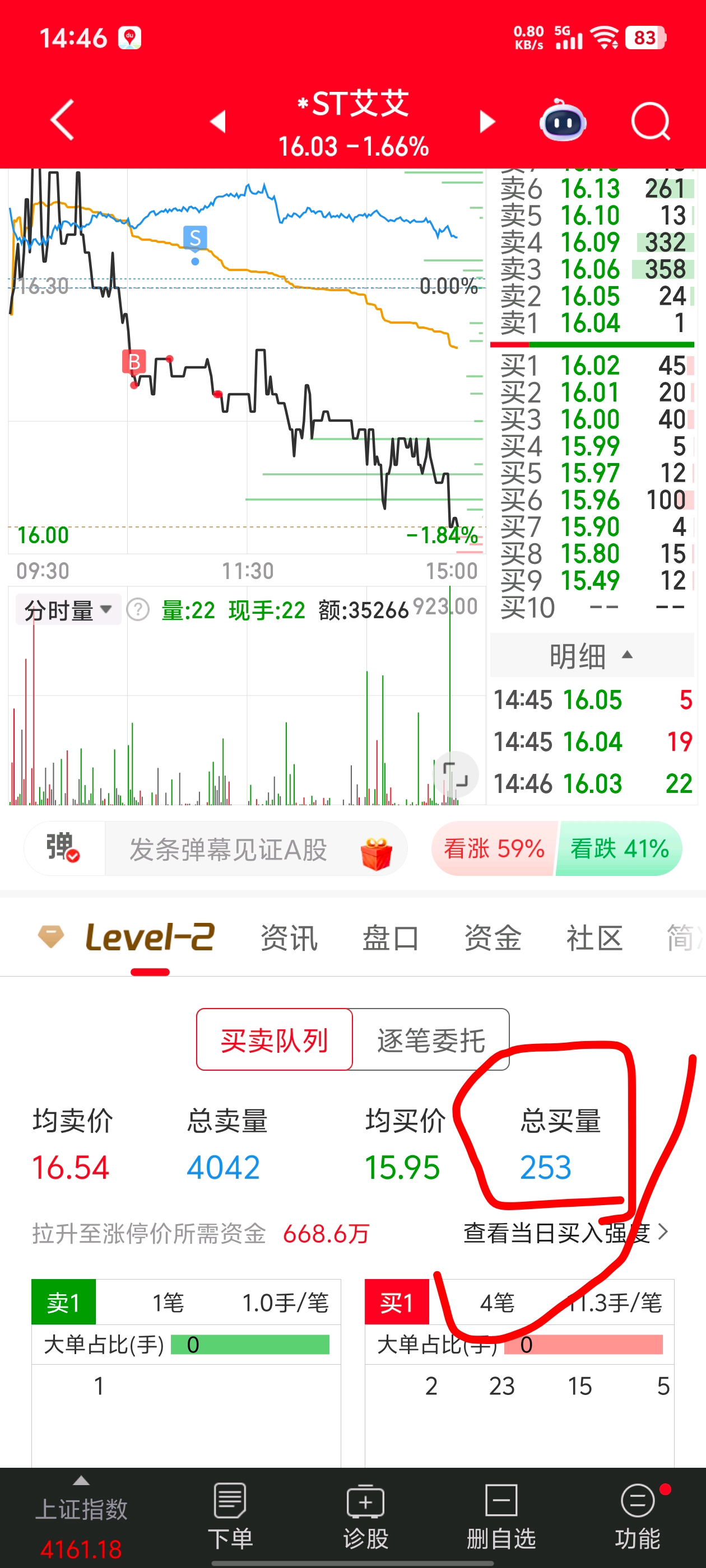 $*ST艾艾(SH603580)$ 250手就能打到跌停,没人跟着完了,自己在那左手到右手。