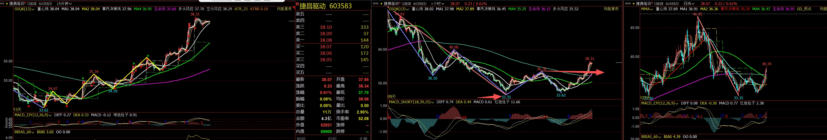 捷昌驱动20260104:随着一小时级别上破前低回踩不破新低之后再创新高的123法则完成,确定了日线低点33.35日线低点,开启日线级别上涨段;再看短周期级别15分钟,一个上涨中枢都未构建的强势上涨,异常强势,回调就是加仓的机会。就看给不给中枢构建的2b或者回踩2b,且行且珍惜!#复盘记录# #周度策略# #实盘记录#