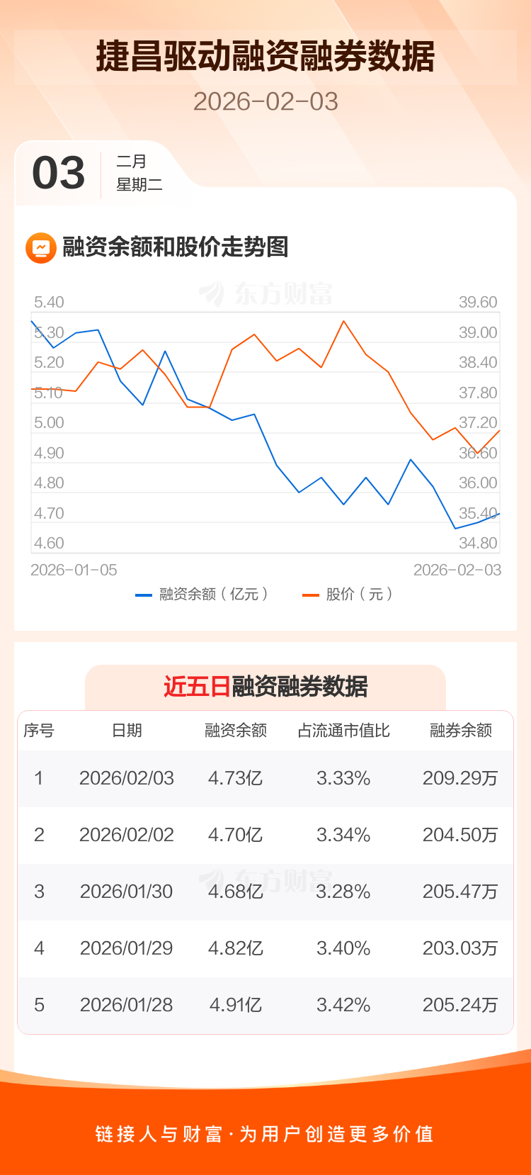 交易所最新数据显示,捷昌驱动于2026年2月3日获融资买入1932.45万元,融资偿还1564.44万元,当日融资净买入368.02万元。目前,该股融资余额4.73亿,占流通市值比例为3.33%。