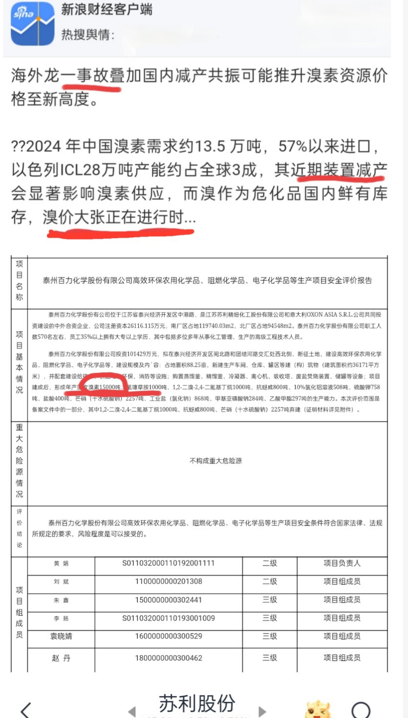 苏利早间重磅利好:1,全球最大溴素化工厂爆炸停产!溴素将突破10万/吨!2,苏利