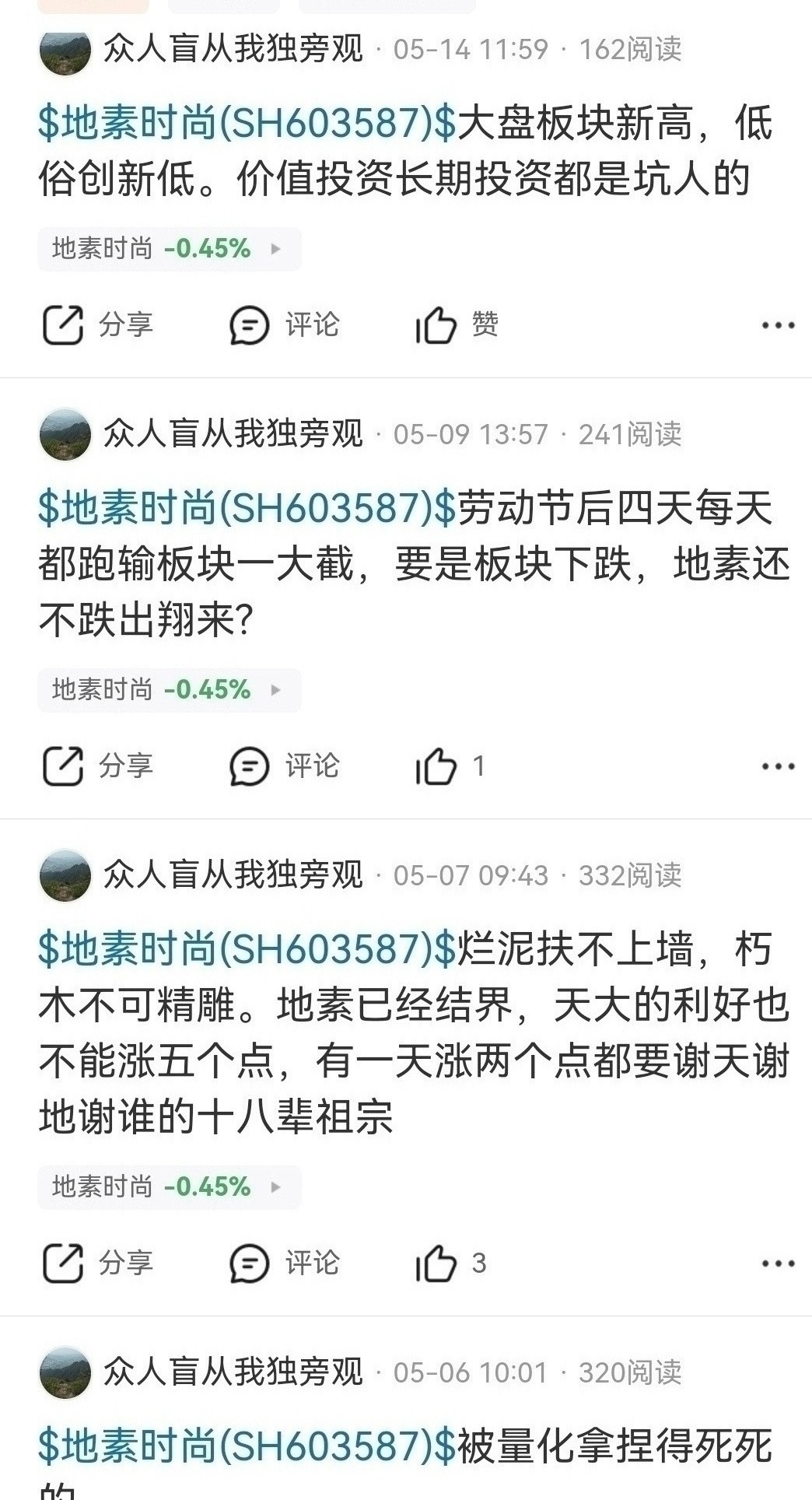 $地素时尚(SH603587)$ 放量突破年线回踩年线在12.10形成日线低点,周线主升启动,服装板块平均市盈率七十八倍,从去年低点涨幅翻倍,今年补涨也至少翻倍,季线底部中长线至少十倍涨幅,卖在季线底部十元左右唱空攻击人的资金北向入场最后买入机会,参股国联民生证券,投资卫哲基金获利丰厚