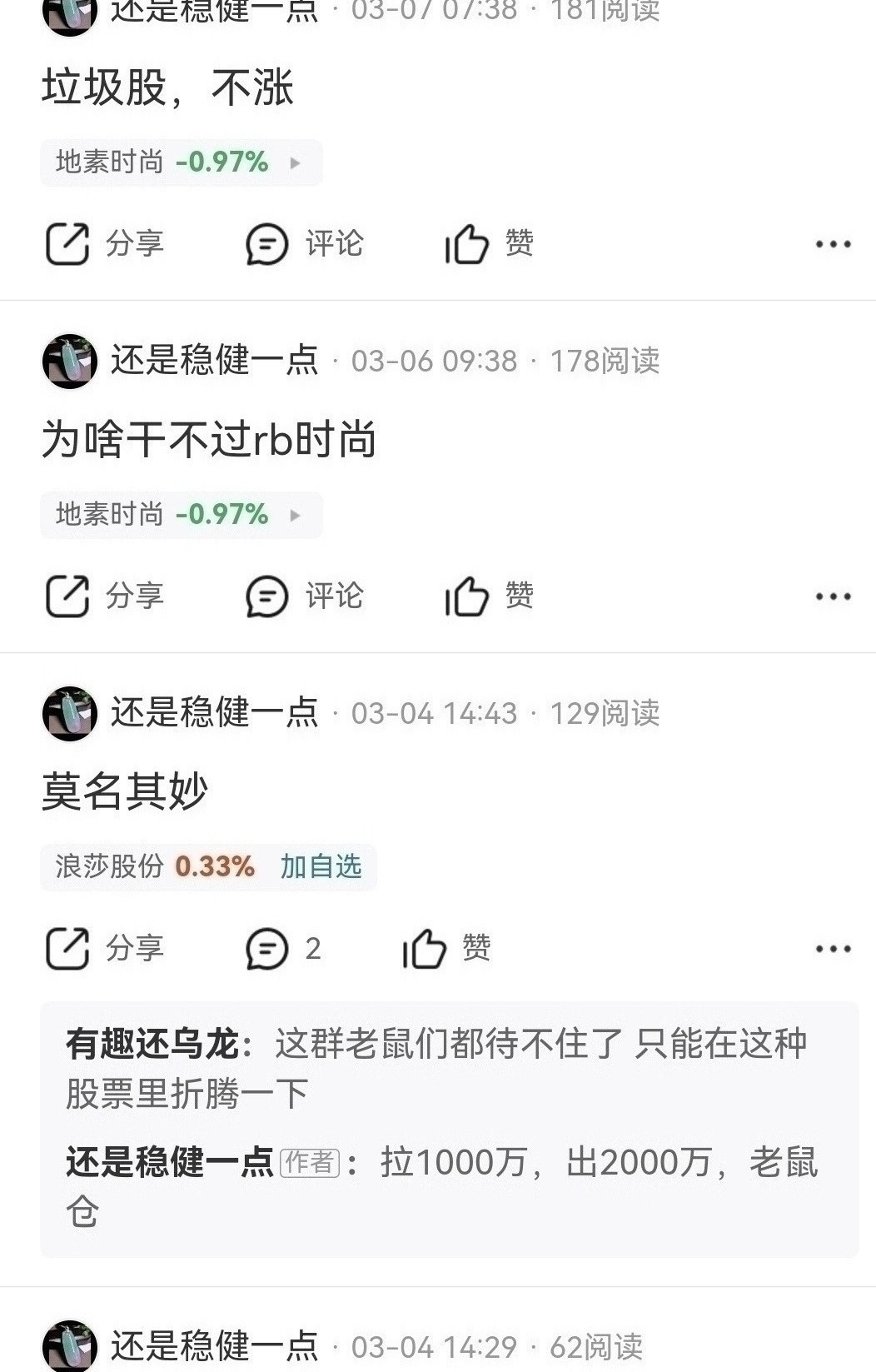 $地素时尚(SH603587)$ 首发经济谷子经济概念,季线底部绩优股,年利润稳定三亿以上,现金资产三十多亿,中长线十倍涨幅以上,北向资金去年九月十元左右清仓踏空,踏空后唱空没有意义,股友0660l6v595也是山东ip还是稳健一点,破坏投资环境坚决抵制打击这种行为,服装板块从去年低点涨幅翻倍,补涨翻倍行情在春节前