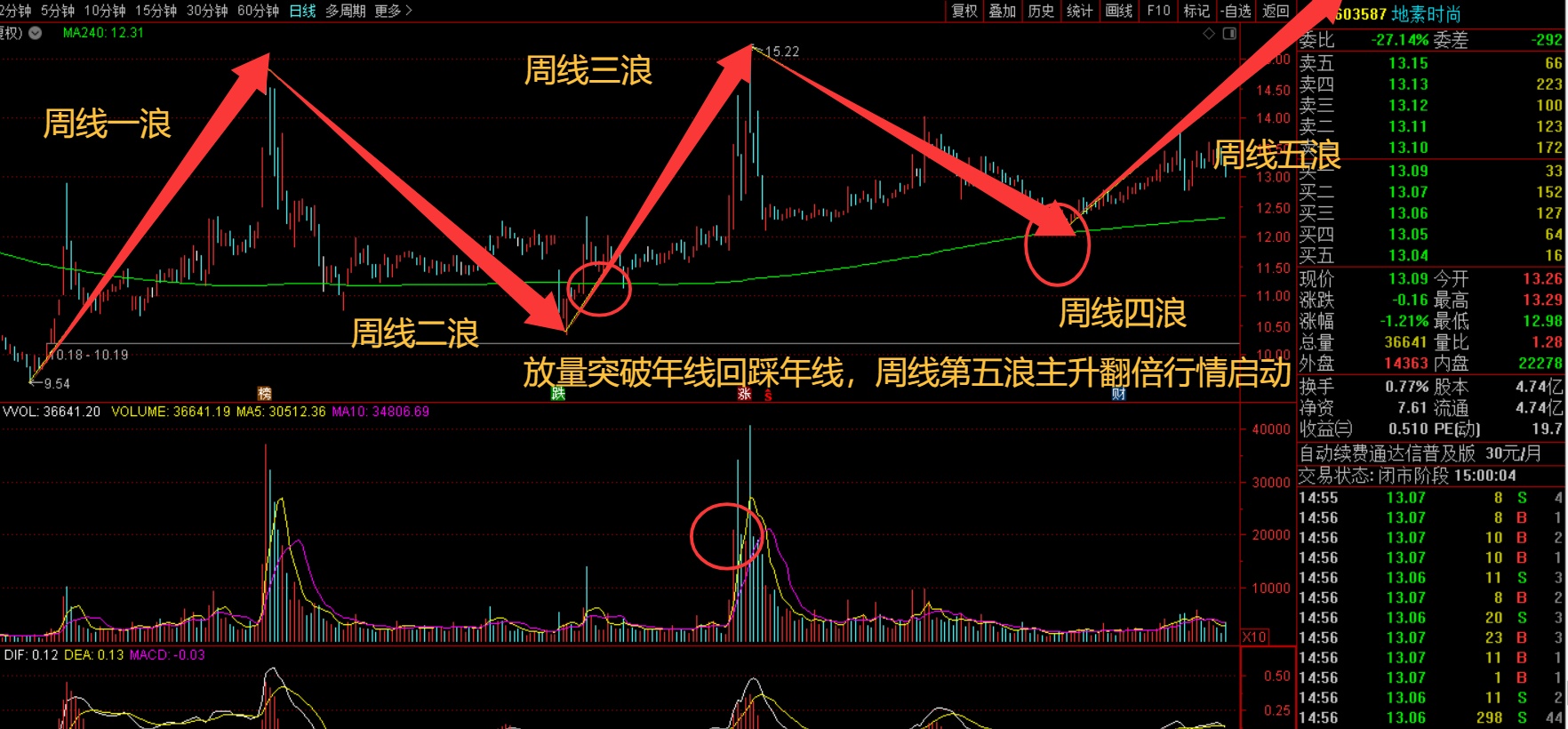 $地素时尚(SH603587)$ 放量突破年线回踩年线形成日线买点,周线第五浪主升,日线二次探底后,60分钟上涨回调形成日线上涨趋势三浪三启动低点,目前就是三浪三启动低点附近,资金在上涨起爆点打压股价胆子够肥,大胆满仓布局,本周涨幅落后服装板块百分之三以上,短线补涨空间不错,周线第五浪主升春节前补涨也至少翻倍,服装板块从前年九月低点涨幅翻倍了