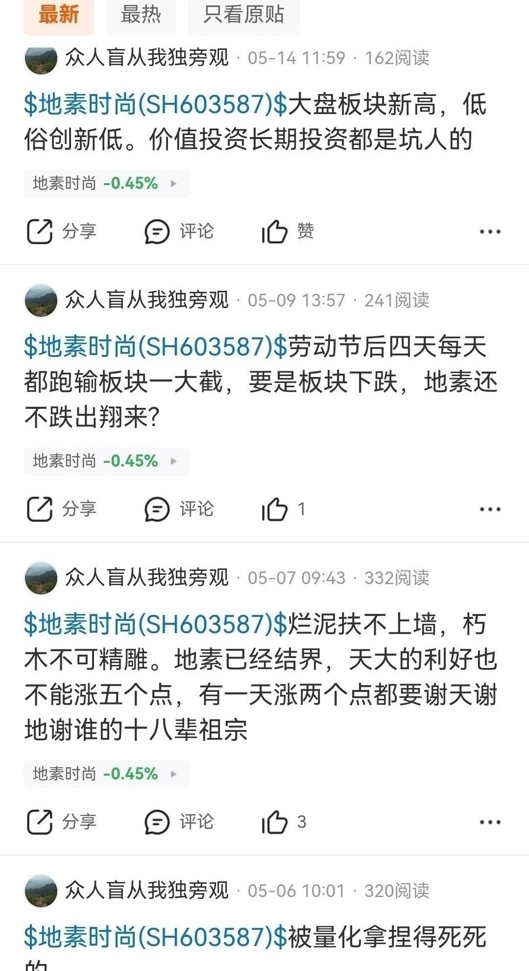 $地素时尚(SH603587)$ 基本面稳健优秀,服装板块中顶尖,和服装板块走势结构一样,前年低点同时形成季线底部,相对于服装补涨空间百分之六十以上,卖在季线底部十元左右唱空攻击人的资金北向入场最后回补仓位机会,放量突破年线回踩年线有效确认周线第五浪主升补涨翻倍跨年行情启动,季线底部中长线至少十倍涨幅