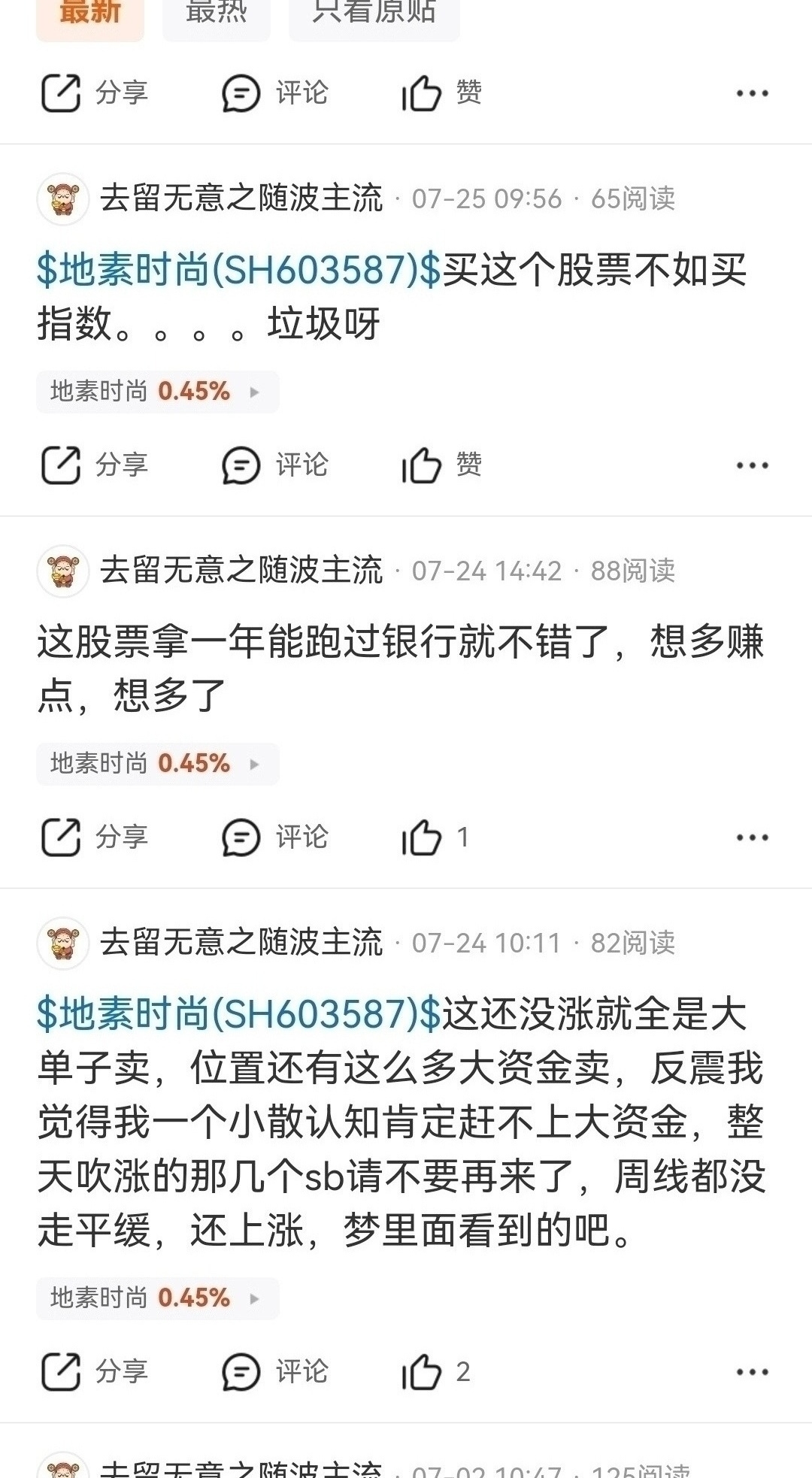 $地素时尚(SH603587)$ 地素时尚从前年到现在周线一、三浪涨幅都是百分之五十左右,目前涨幅落后服装板块百分之六十左右,放量突破年线回踩年线日线买点,形成周线第五浪,那补涨也是主升,至少翻倍,季线底部十元附近清仓卖出踏空后唱空攻击人的资金最后买入机会,大盘服装板块周线第五浪上涨启动,大盘上涨目标6000以上