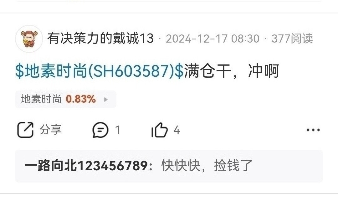 $地素时尚(SH603587)$ 生肖马首发经济ip经济龙头,布局AI电商,机器人服装,投资创投基金民生证券获利丰厚,季线底部中长线至少十倍涨幅,卖在季线底部十元左右清仓踏空后唱空攻击人的资金最后买入机会,放量突破年线回踩年线周线主升补涨翻倍跨年行情启动,服装板块平均市盈率八十倍左右,从前年低点涨幅翻倍,补涨空间百分之六十以上