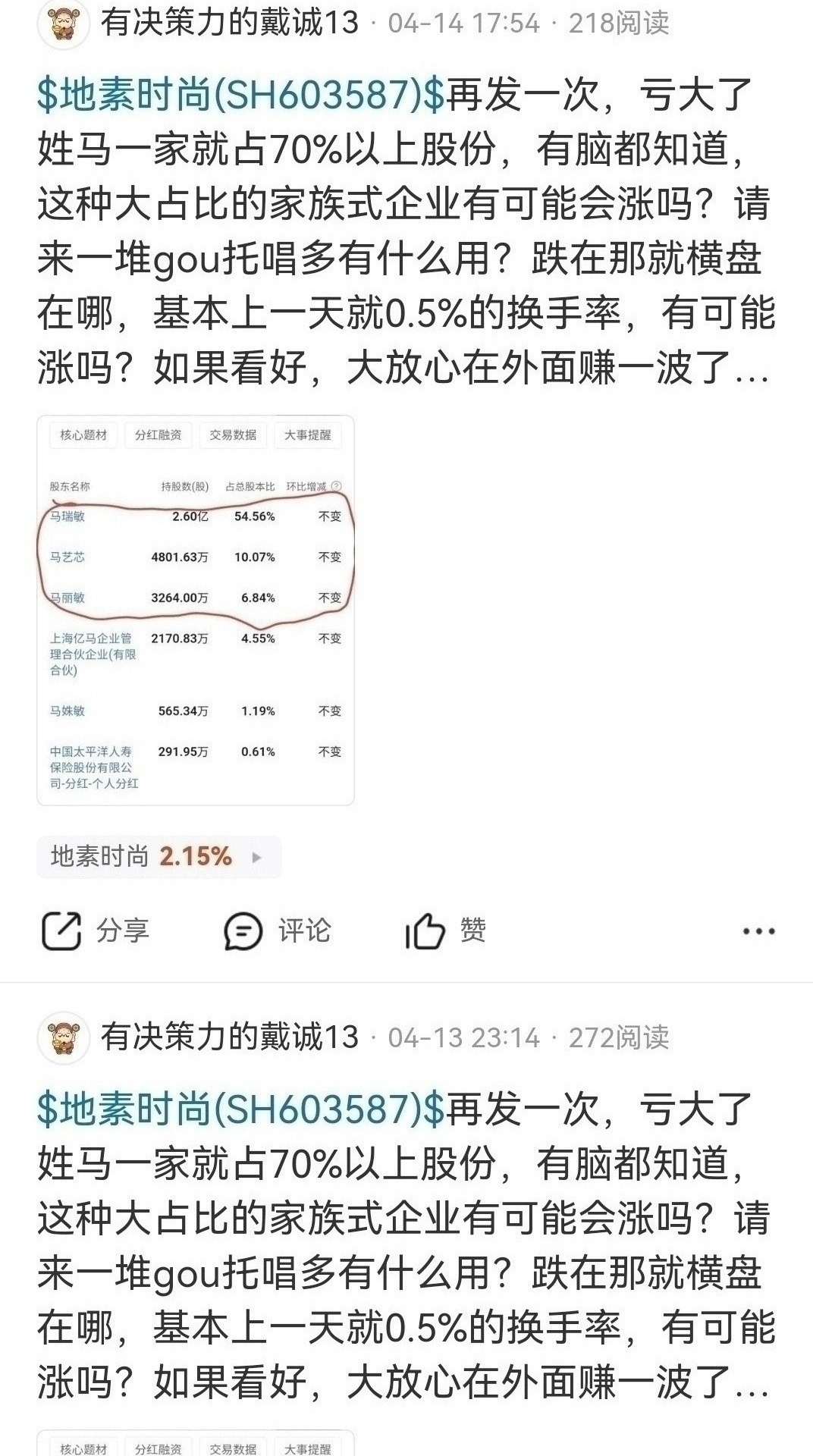 $地素时尚(SH603587)$ 业绩稳定,设计团队顶尖,每年利润稳定三亿以上,上市总分红超过融资额,每年股票回购还有三十多亿现金,消费龙头牛市六十倍估值合理,季线底部中长线至少十倍涨幅,卖在季线大底十元左右唱空攻击人的资金最后回补仓位机会,放量突破年线回踩年线周线二次探底,周线主升补涨翻倍行情启动,相对于服装板块补涨空间百分之六十以上