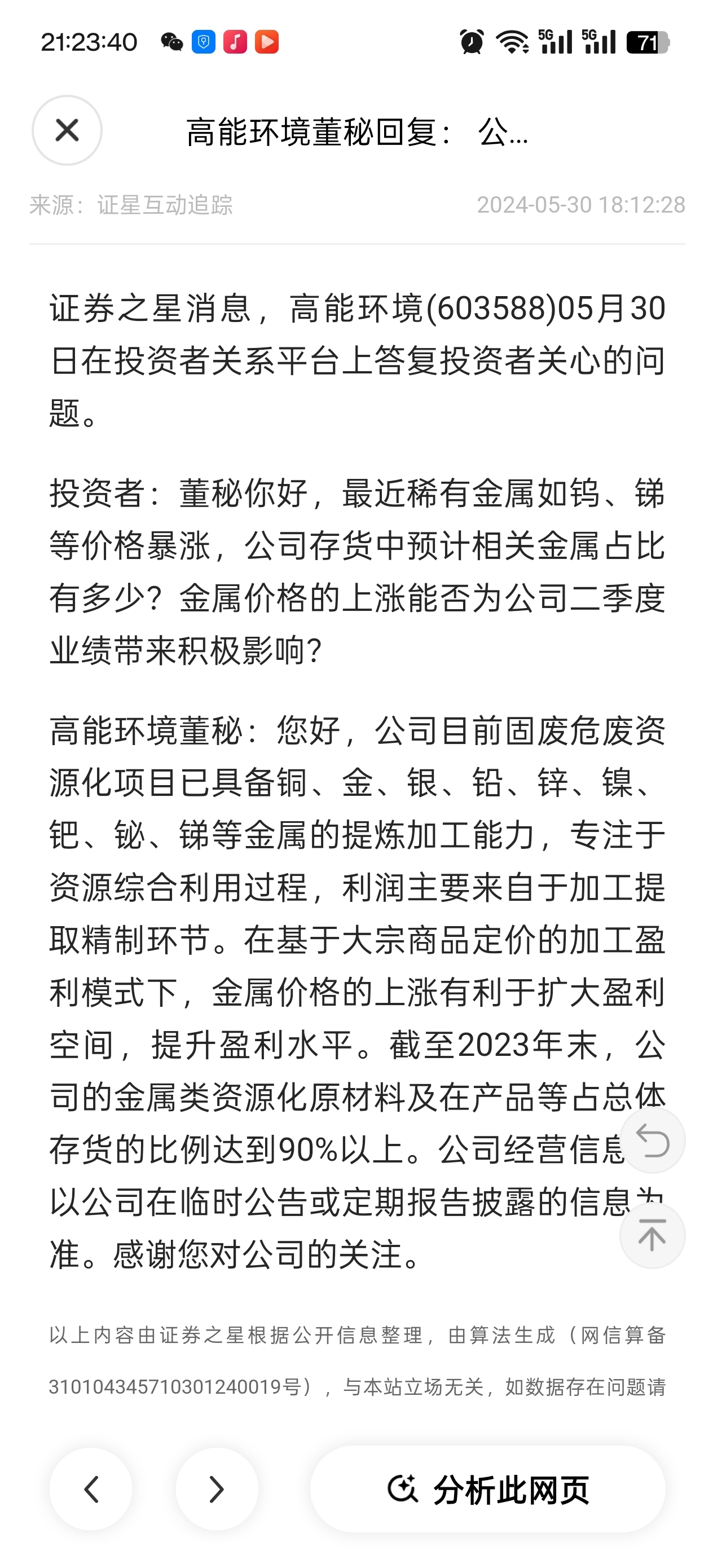 $高能环境(SH603588)$ 关于金属涨价,能否给高能环境带来切实的利润增长,董秘回复过这个问题!董秘明确表示金属涨价能带来公司利润的增长,其次,公司有大量的原材料存货!董秘明确表示靖远高能存货占了大部分,最新三季报存货,已经达到了54亿!公司也明确表示提炼精铋的原材料是含铅废渣!注意是废渣,这个东西是危险,贮存管理都是有严格规定的。你觉着这种严格管控的东西会随意涨价?