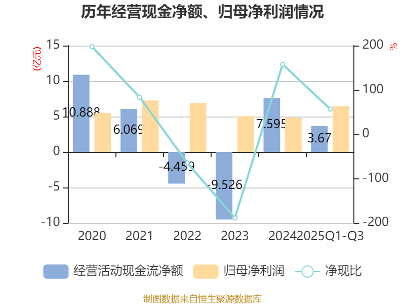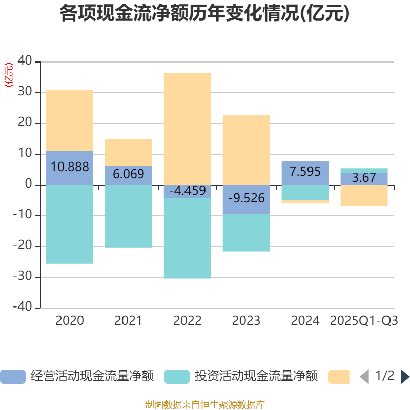 2025年前三季度,公司经营活动现金流净额为3.67亿元,同比增长67.29%;筹资活动现金流净额-6.86亿元,同比减少11.67亿元;投资活动现金流净额1.62亿元,上年同期为-7.45亿元。